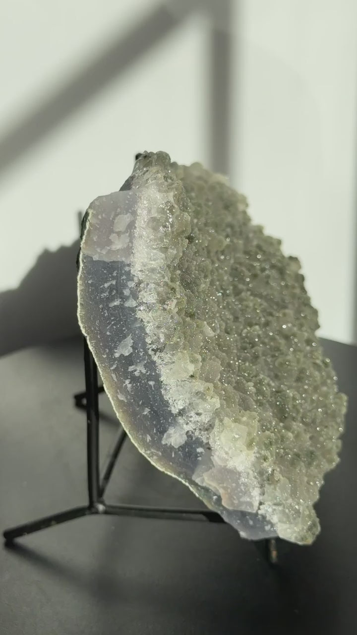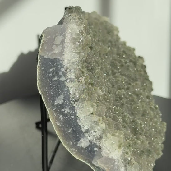 Natural green amethyst featuring a sparkling, botryoidal-like druzy surface with soft sage tones and subtle crystalline texture throughout. A sculptural display piece with organic edges. Note the unique clear quartz point as well.