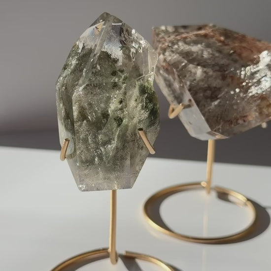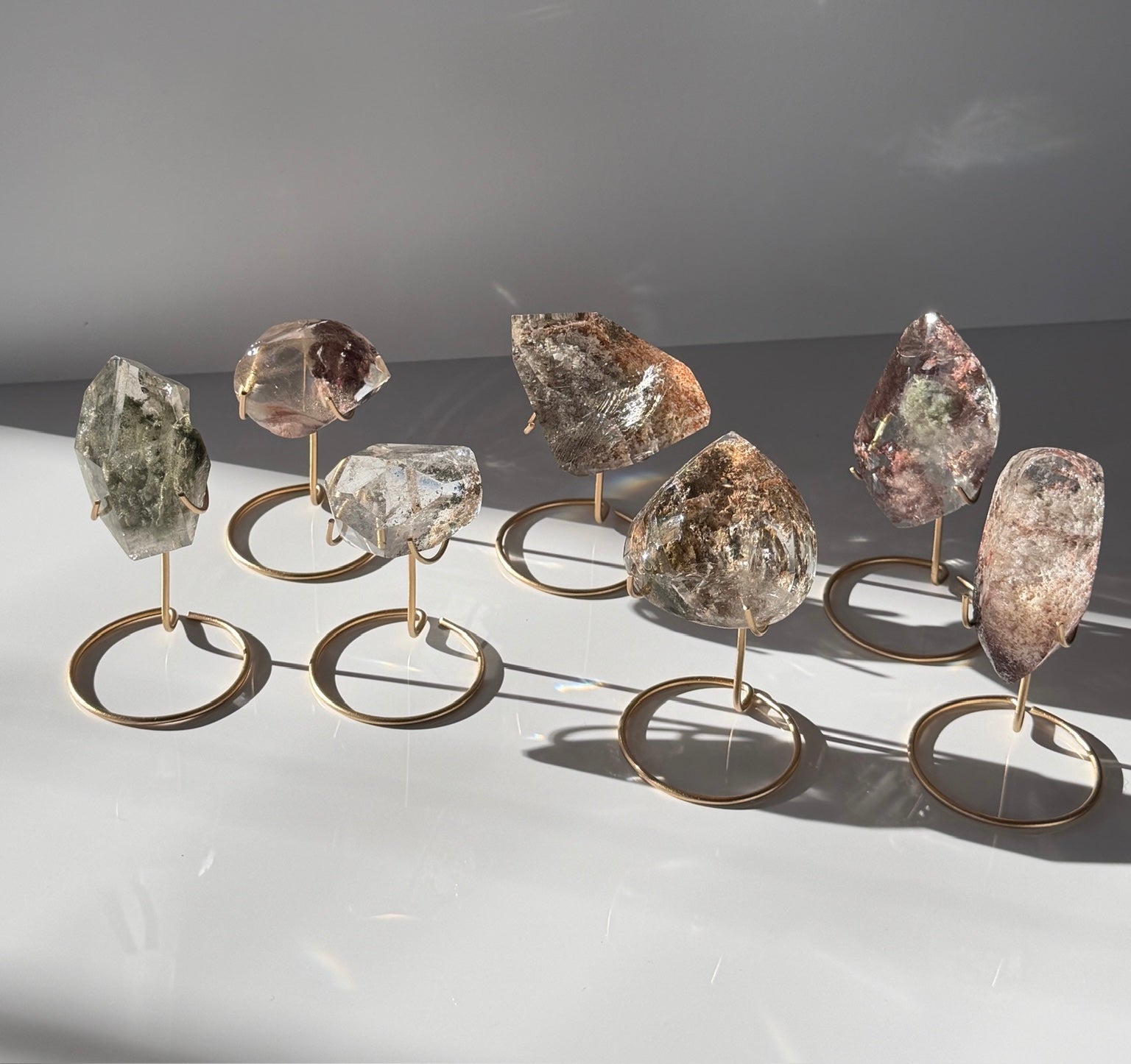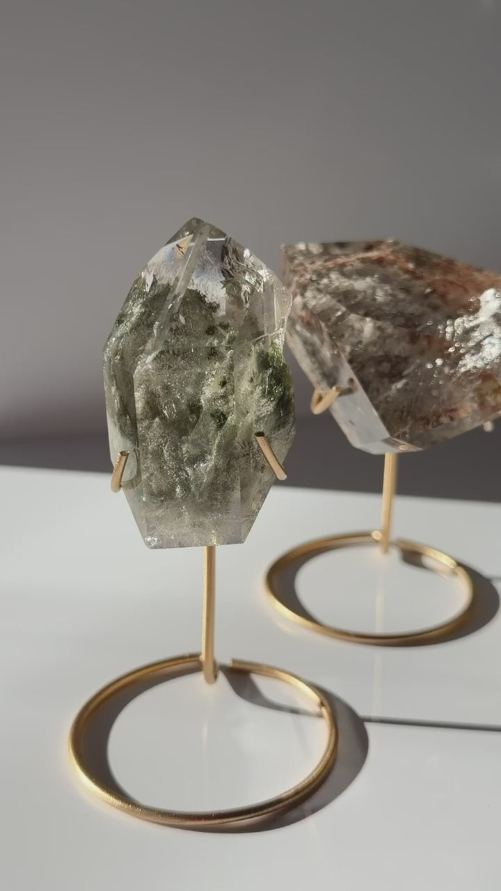 High grade polished Brazilian garden (Lodolite) quartz, each displayed on a modern gold stand.