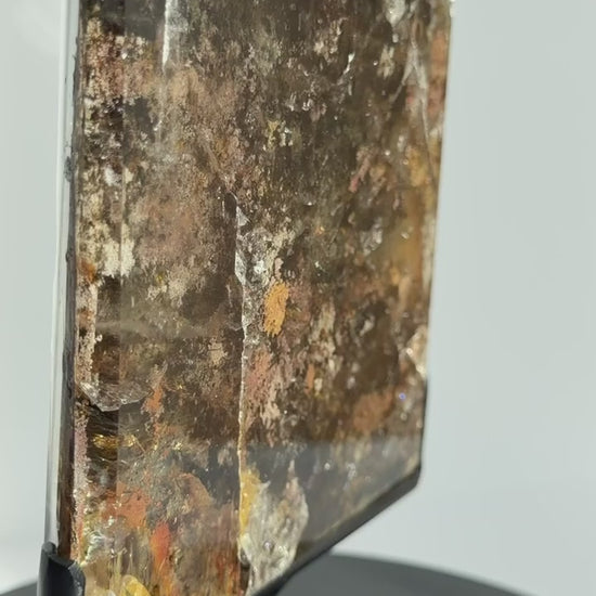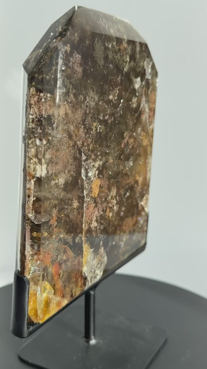 A substantial garden quartz slab featuring layered mineral landscapes in earthy tones of olive, rust, charcoal, and gold. This piece shows natural iron staining, internal fractures, and scattered rutile sprays on the back face.