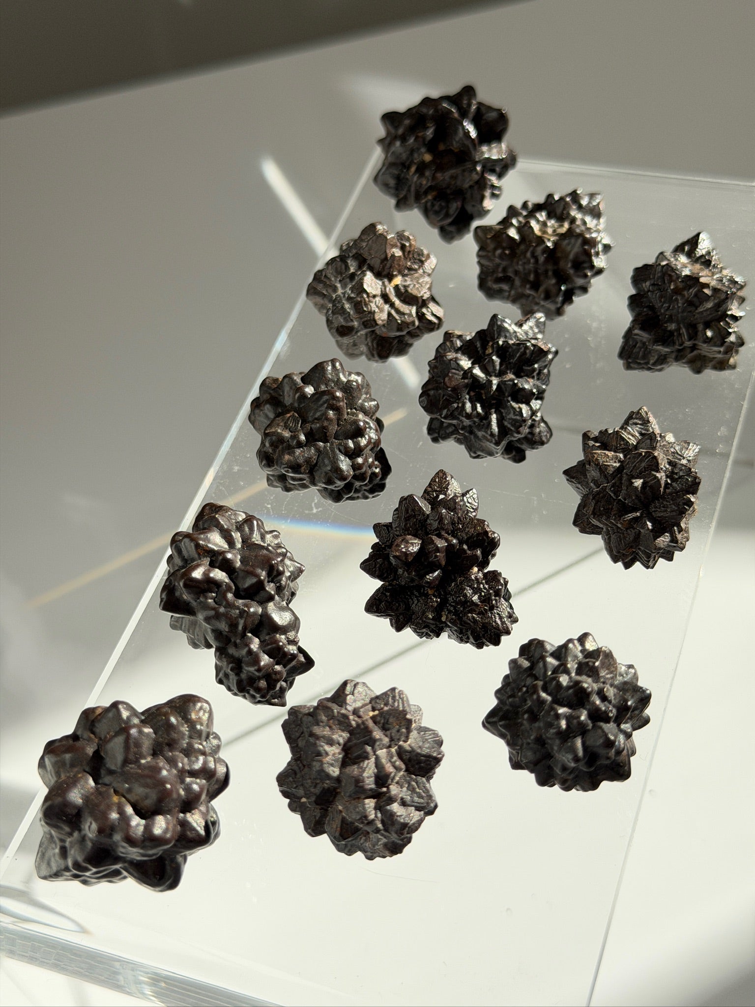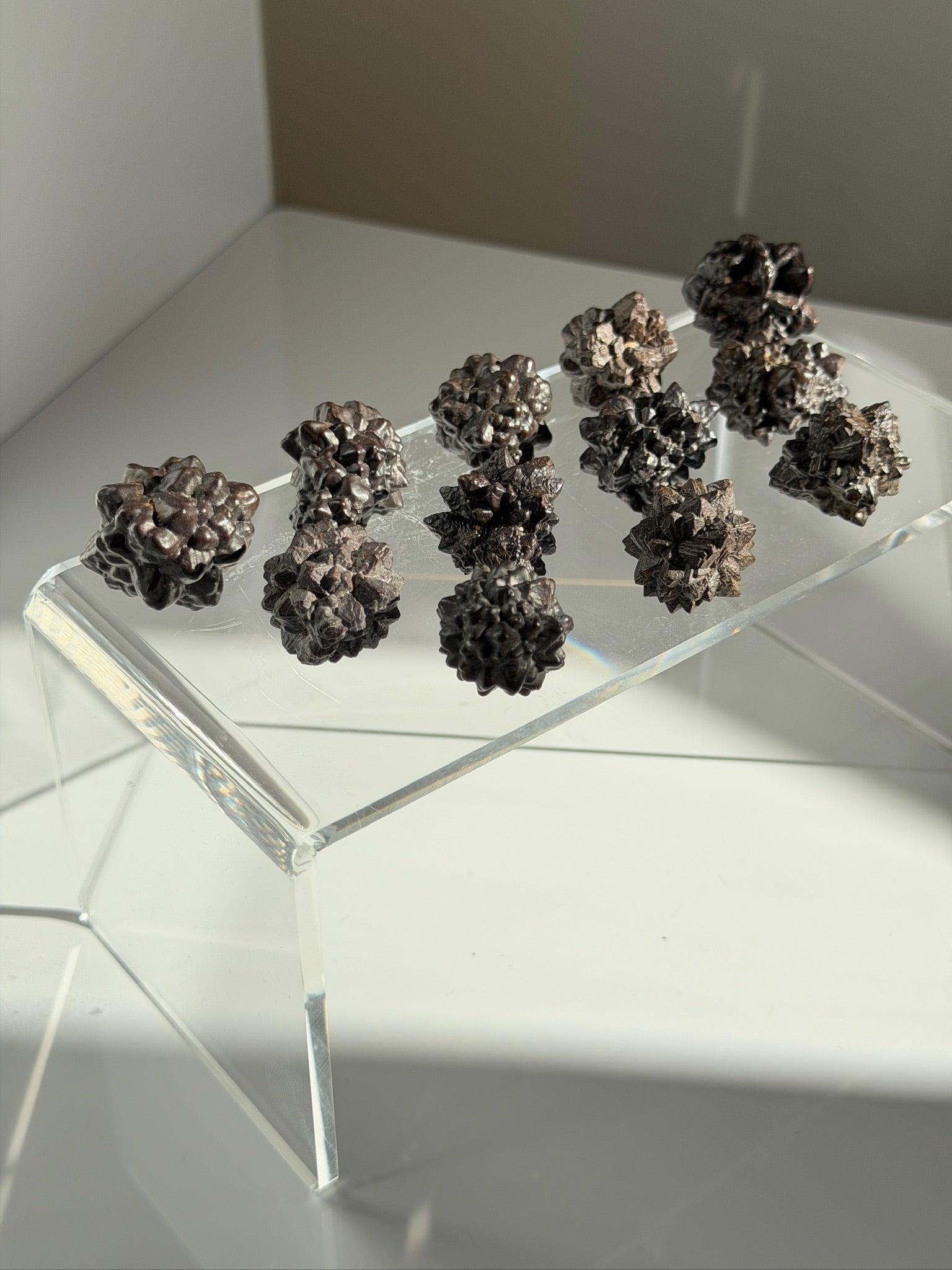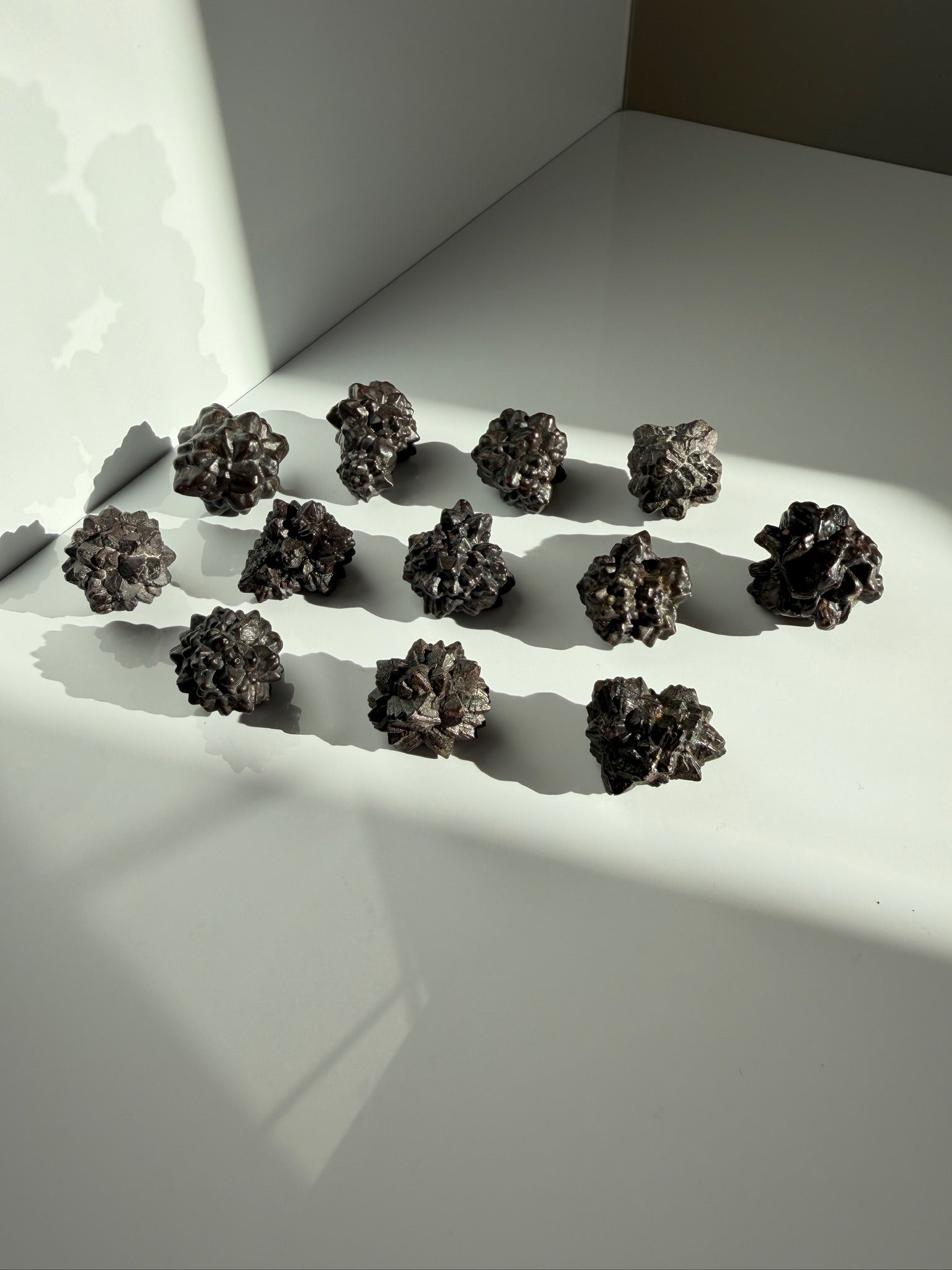 Prophecy Stone is a rare pseudomorph from the White Desert of Egypt, formed when Marcasite and Pyrite naturally transformed into Hematite and Limonite while retaining their original starburst crystal structure. Found in the New Valley region, these striking formations are prized for both their unique mineralogical history and bold appearance.