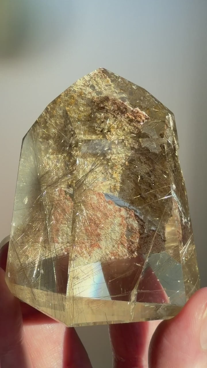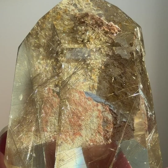 Silver Rutilated Quartz with Lodolite displaying delicate silver rutile starbursts suspended within polished, high-clarity clear quartz and alongside earthy garden inclusions. This elegant piece showcases beautiful internal light play and delicate, airy needle structure.